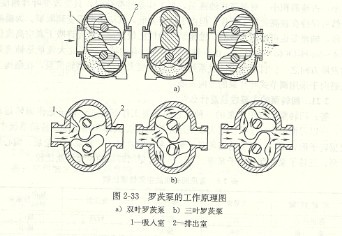 圖2 33為雙葉羅茨泵和三葉羅茨泵的工作原理圖。其原理與齒輪泵相似,當轉子旋轉時將與泵體形成的空間內液體沿泵體殼壁從吸入室排送到排出室。當軸每轉一周,雙葉羅茨泵吸、排各兩次,而三葉羅茨泵吸、排各三次。